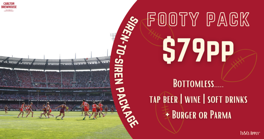 As the home of Carlton Draught, Carlton Brewhouse boasts a fantastic beer garden to enjoy some of Australia’s favourite beer, as well as a great brewery experience. Being both dog and family friendly, everyone is welcome at the Brewhouse. Grab a beer and enjoy some complimentary pool, darts, Nintendo Switch, table tennis or board games. We offer a Siren-to-Siren Footy Pack for only $69 - which include bottomless drinks (beers, wines, soft drinks) and a burger or parma