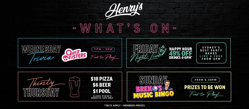 THE PUB IN A CLUB Henry's is the perfect place to watch all the major sports events (NRL South Sydney Rabbitohs, NFL and more) live on our 110″ projector screen and HD plasmas. What's On at Henry's: -Wednesday: Quiz Meisters trivia 7pm -Thursday: $18 pizza $6 beer $1 pool -Friday: 49% off drinks (4-6PM), 50ft Putt 4pm, live bands 8pm -Saturday: 49% off drinks (12-2PM) -Sunday: Breko's Music Bingo from 6:30pm