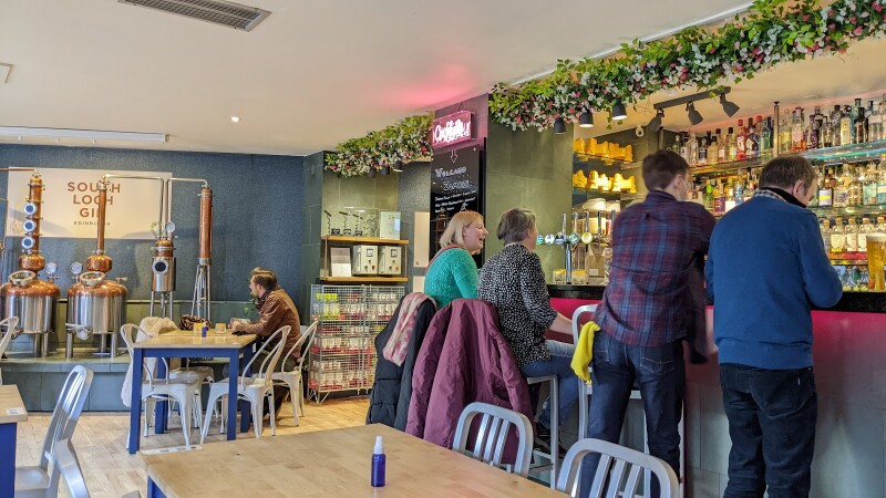 Intimate cocktail bar with booths, a wide range of gins, gourmet burgers, flatbreads and steaks.