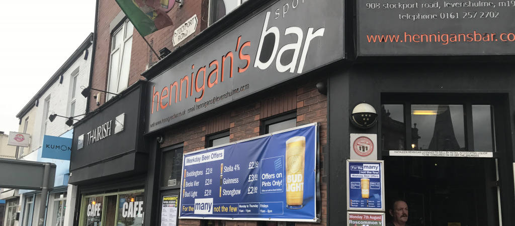 Hennigan's Sport's Bar is based on Stockport Road, Levenshulme and has been showing the best in Live Sport for over 25 years. As the name suggests - Hennigans is sport's crazy and home to all sports fans with a big City and United following as well as horse racing, cricket, motor racing and fans of all sport. You can't turn you head at the pub without clocking a TV. With multi-screens in full HD and a state of the art sound system - Hennigans is the place to be for live sport. The pub can show multi sports at any one time - ask staff and they will accommodate your viewing needs. Look out for some great beer offers, especially midweek where you can grab pints of Beck Vier, Bud Light, Stella 4% and it's specialty Boddingtons for only '2.50 a pints. Check out our other offers - especially for Gaelic Games and European Football matches. Look out for iconic images throughout of some of the best moments ever from our favourite Georges - Best and Kinkladze to the 66 World Cup and even the Irish rowers.